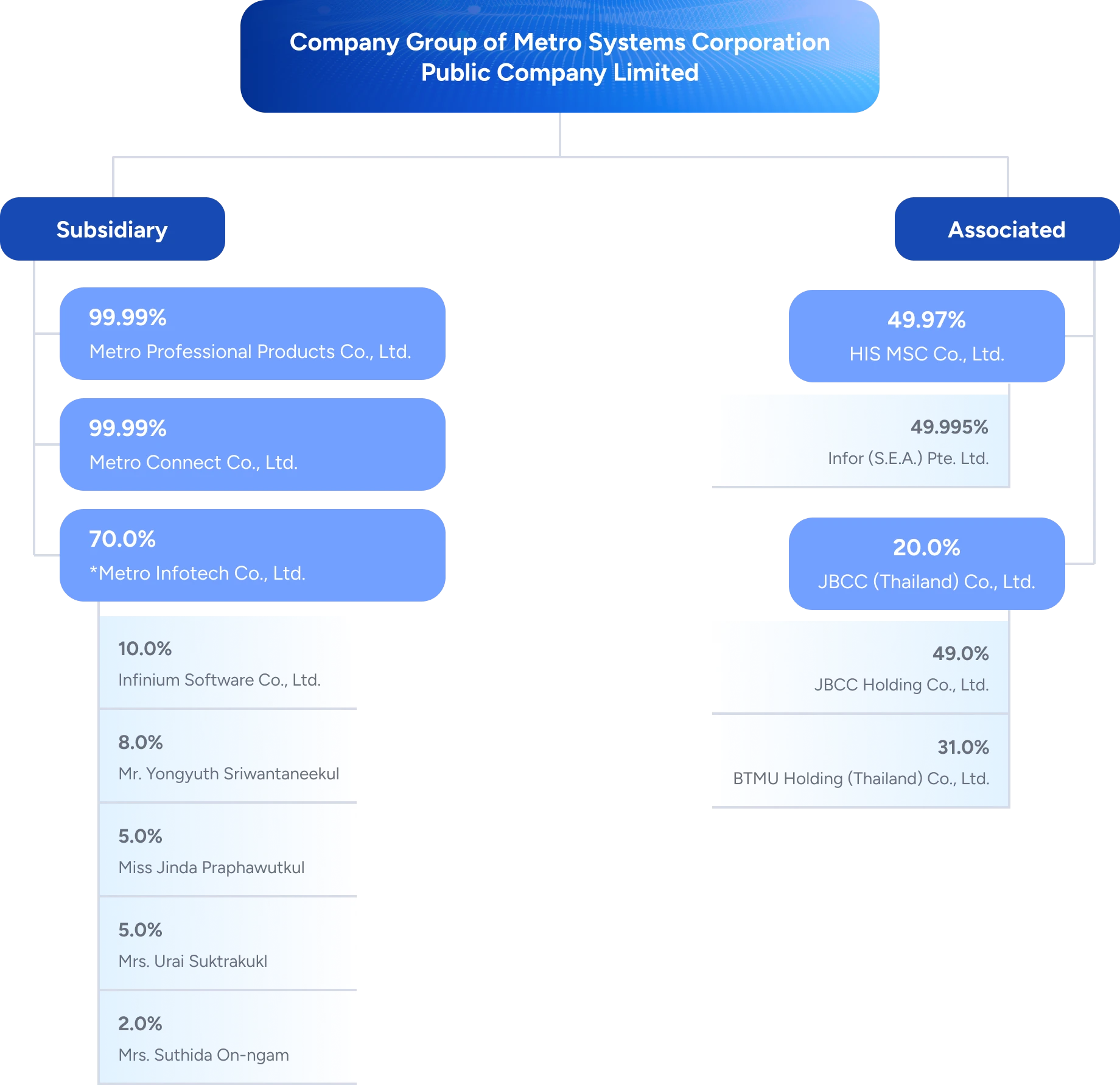 The Company has invested in business related to information technology systems to promote and support the operations of the Company’s core business in order to respond to the needs of customers completely and efficiently. There are 5 affiliated companies comprising 3 subsidiaries, namely Metro Professional Products Company Limited, Metro Connect Company Limited, Metro Infotech Company Limited and 2 associated companies, HIS MSC Company Limited, JBCC (Thailand) Company Limited, which has different shareholding and management policy set by the main company as follows: