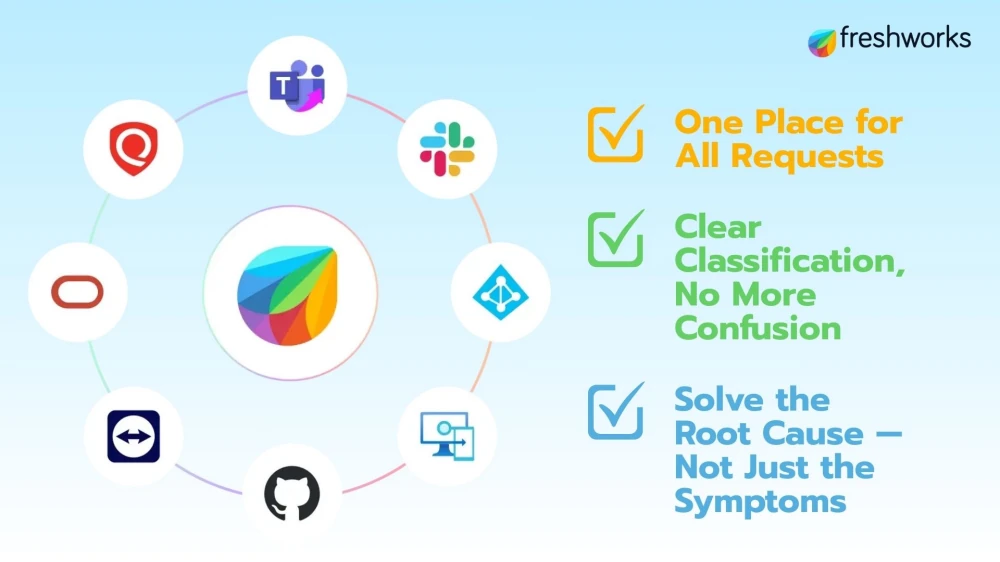 Freshservice intelligently separates work into: Incidents — unexpected issues that require urgent resolution Service Requests — standard requests such as access, equipment, or software This clarity helps IT teams prioritize accurately and ensures critical issues never slip through the cracks.