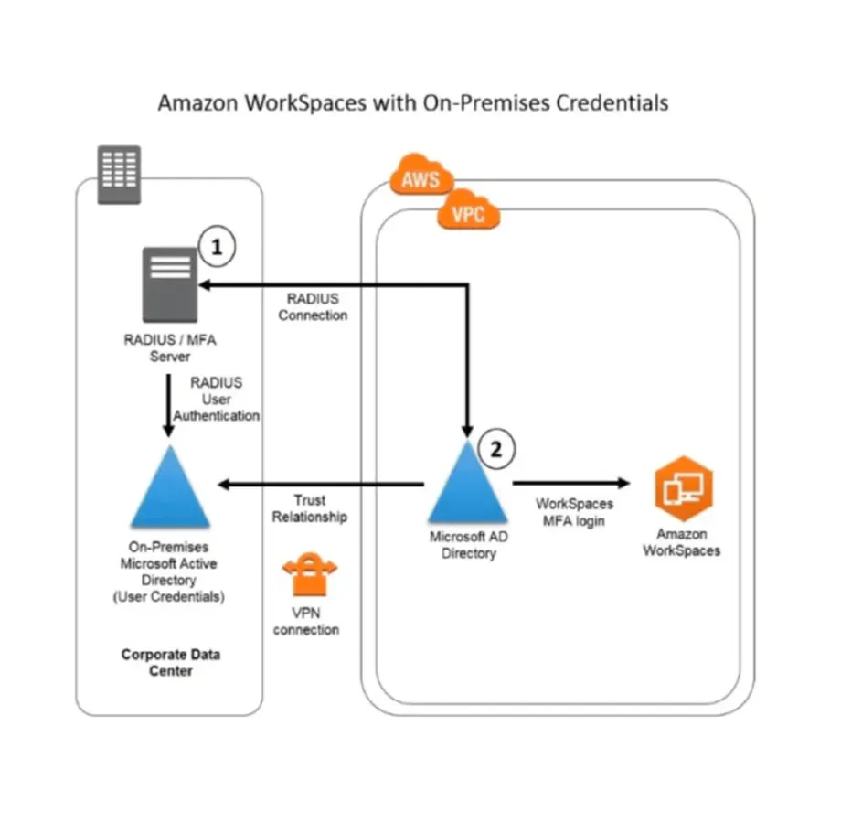 หากต้องการเพิ่มความปลอดภัยผ่าน Multi-Factor Authentication (MFA) ใน AWS Workspaces ควรใช้ AWS Managed Microsoft Directory หรือ AD Connector ร่วมกับเซิร์ฟเวอร์ RADIUS เซิร์ฟเวอร์ RADIUS สามารถตั้งค่าได้ทั้งในองค์กร (On-prem) หรือใน AWS หรือที่ใดก็ได้ที่มีการเชื่อมต่อกับไดเร็กทอรี เพื่อเพิ่มความปลอดภัยในการตรวจสอบสิทธิ์ผู้ใช้