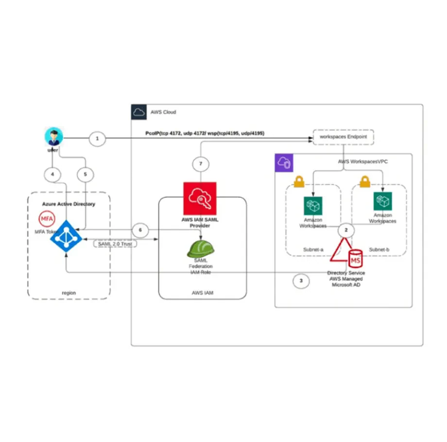 AWS มีคุณสมบัติใหม่ผ่าน SAML 2.0 ซึ่งช่วยในการเชื่อมต่อกับผู้ให้บริการข้อมูลประจำตัว (IDP) เช่น Azure AD, Duo, และ Okta ผู้ใช้จะได้รับการตรวจสอบสิทธิ์จาก IDP และหลังจากที่ได้รับการอนุญาต พวกเขาสามารถเข้าถึง AWS Workspaces ได้โดยตรง