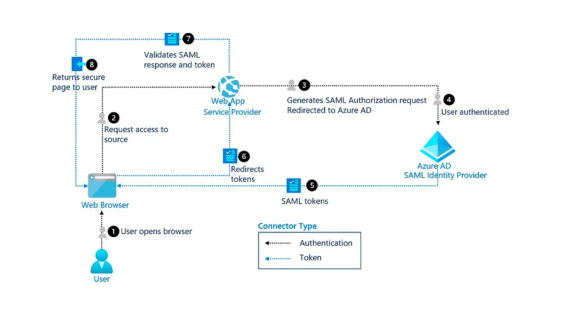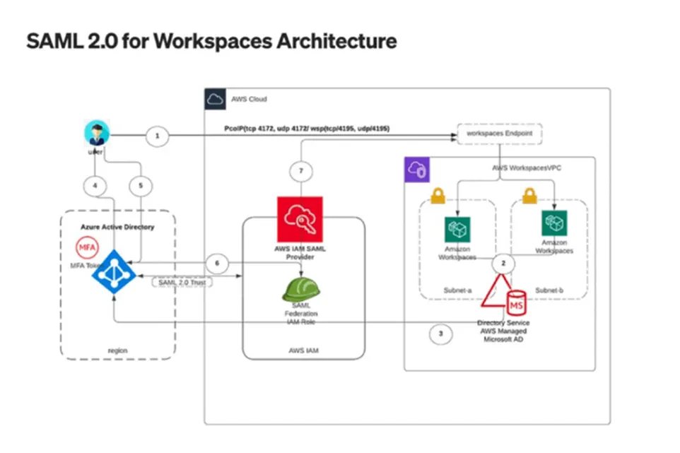 เมื่อพูดถึงการเชื่อมต่อสำหรับการรักษาความปลอดภัย SAML (Security Assertion Markup Language) เป็นเรื่องที่ต้องให้ความสำคัญ ภาษามาร์กอัปนี้มีบทบาทหลักในการยืนยันความปลอดภัยออนไลน์, เนื่องจากมันช่วยให้ผู้ใช้สามารถเข้าถึงแอปพลิเคชันหลาย ๆ แอปพลิเคชันโดยใช้ชุดข้อมูลรับรองการเข้าสู่ระบบเพียงชุดเดียว หลักการของมันคือการส่งข้อมูลการตรวจสอบความถูกต้องระหว่างสองฝ่าย คือ ผู้ให้บริการข้อมูลประจำตัว (idP) และเว็บแอปพลิเคชัน และในกรณีของเรา Azure AD ถูกเลือกใช้เป็น idP ส่วน AWS WorkSpaces เป็นผู้ให้บริการเว็บ แอปพลิเคชัน