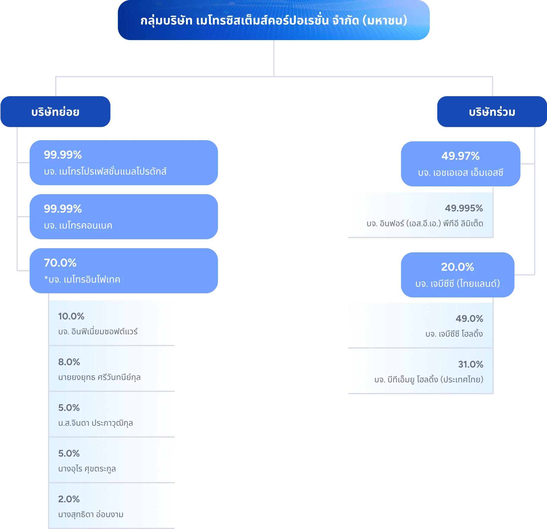 บริษัทได้ลงทุนในธุรกิจซึ่งเกี่ยวเนื่องกับระบบเทคโนโลยีสารสนเทศ เพื่อส่งเสริมและสนับสนุนการดำเนินงานในธุรกิจหลักของบริษัทให้สามารถ ตอบสนองความต้องการของลูกค้าได้อย่างครบถ้วนและมีประสิทธิภาพ โดยมีบริษัทในเครือรวม 5 บริษัท ประกอบด้วยบริษัทย่อย 3 บริษัท ได้แก่ บริษัท เมโทรโปรเฟสชั่นแนลโปรดักส์ จำกัด บริษัท เมโทรคอนเนค จำกัด บริษัท เมโทรอินโฟเทค จำกัด และบริษัทร่วมจำนวน 2 บริษัท ได้แก่ บริษัท เอชไอเอส เอ็มเอสซี จำกัด บริษัท เจบีซีซี (ไทยแลนด์) จำกัด ซึ่งมีความแตกต่างในการเข้าถือหุ้นและการกำหนดนโยบาย การบริหารโดยบริษัทหลัก ดังนี้